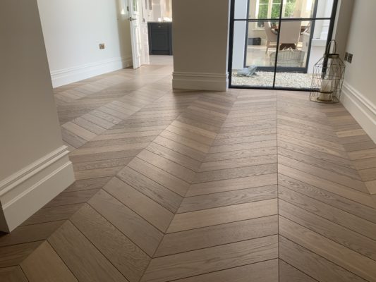 Luxurious Renaissance Chevron Angelico. 120mm x 21mm x 525mm with a timeless White UV Oil/Wax finish and birch plywood base which is suitable for underfloor heating. See our website for further details and full range of herringbones: https://lnkd.in/eAxv_ny #WhiteriverGroup #WoodForLiving #Herringbone